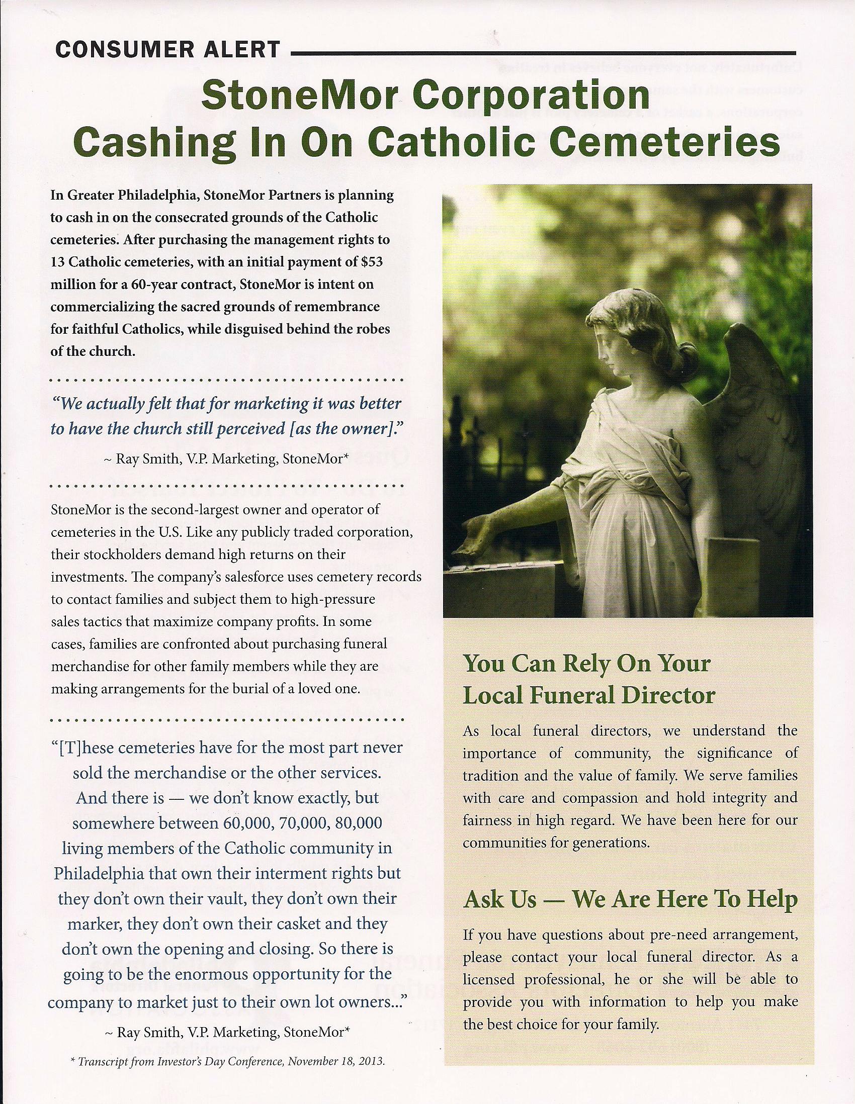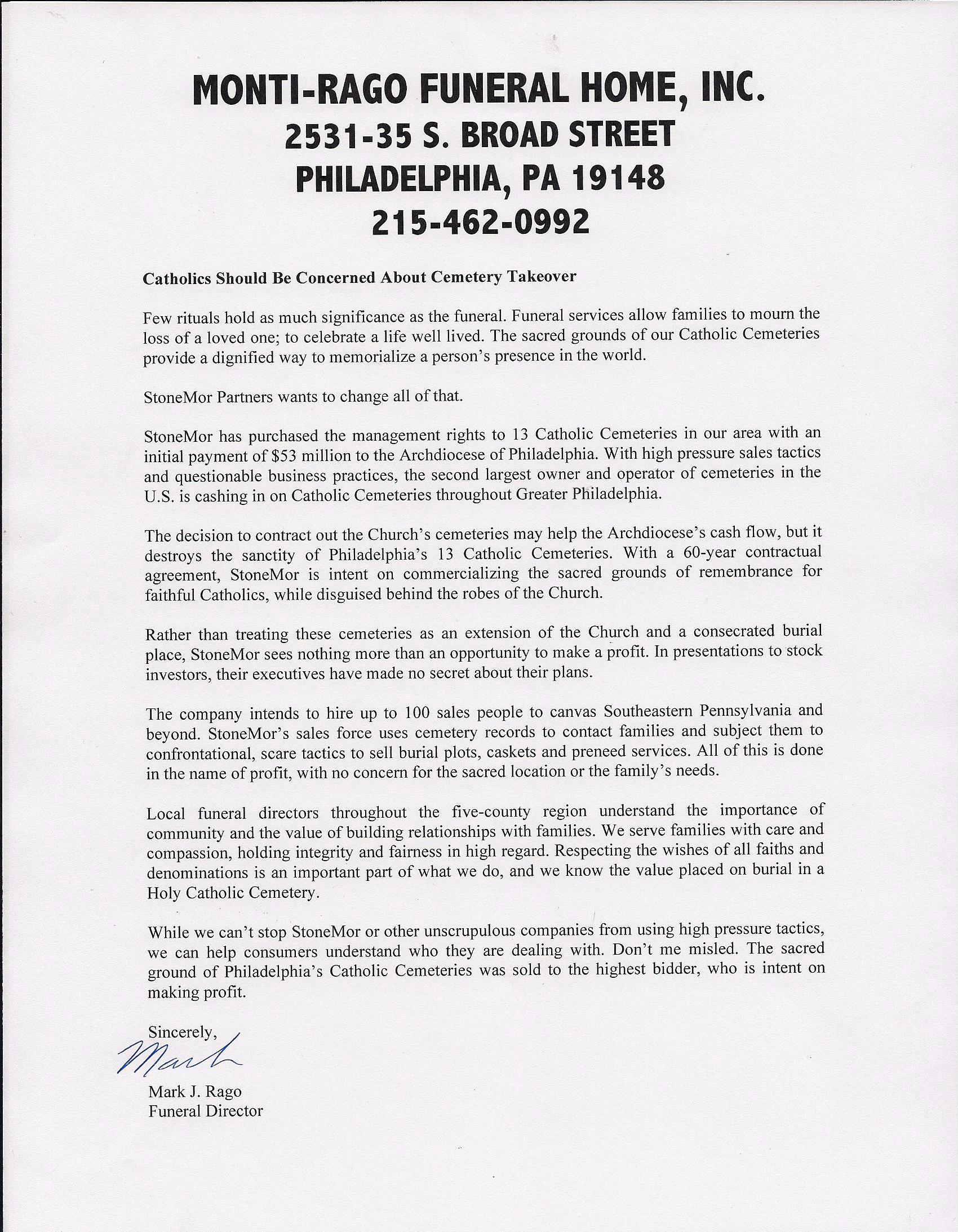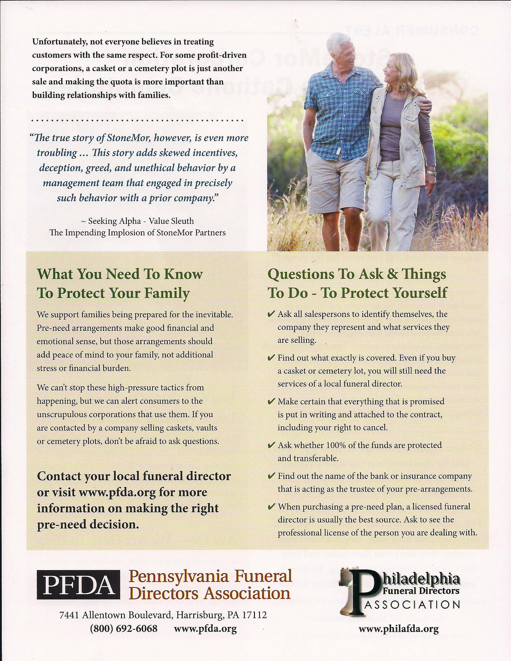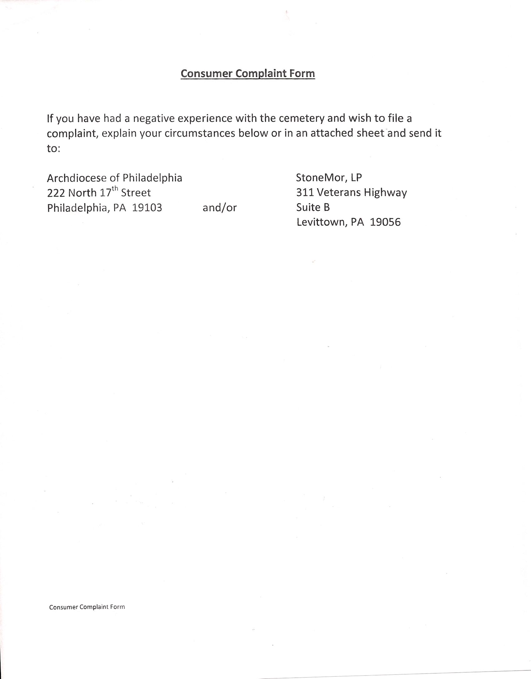 StoneMor Partners and Archdiocese of Philadelphia Consumer Complaint Form