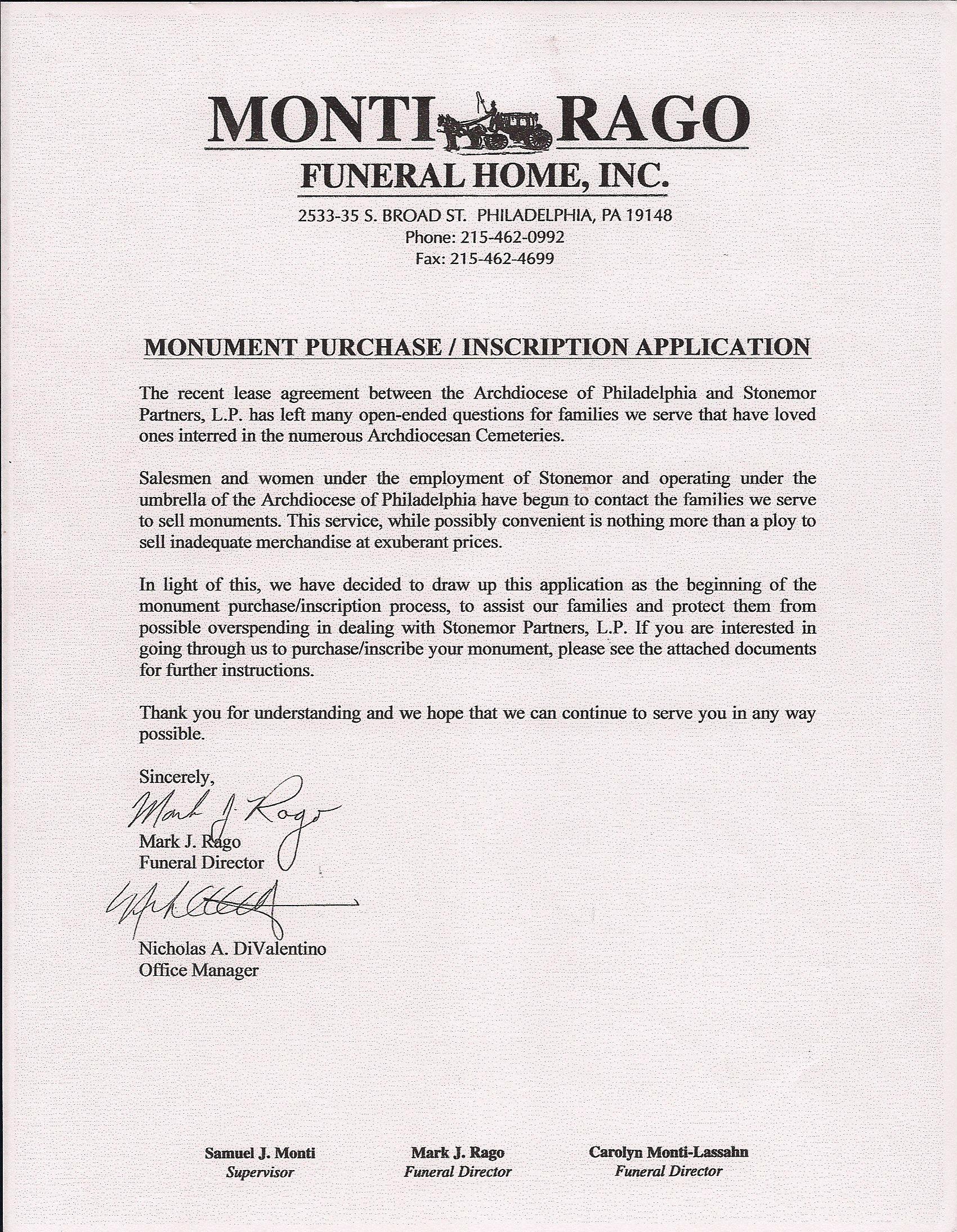 StoneMor Partners and Archdiocese of Philadelphia Consumer Complaint Form